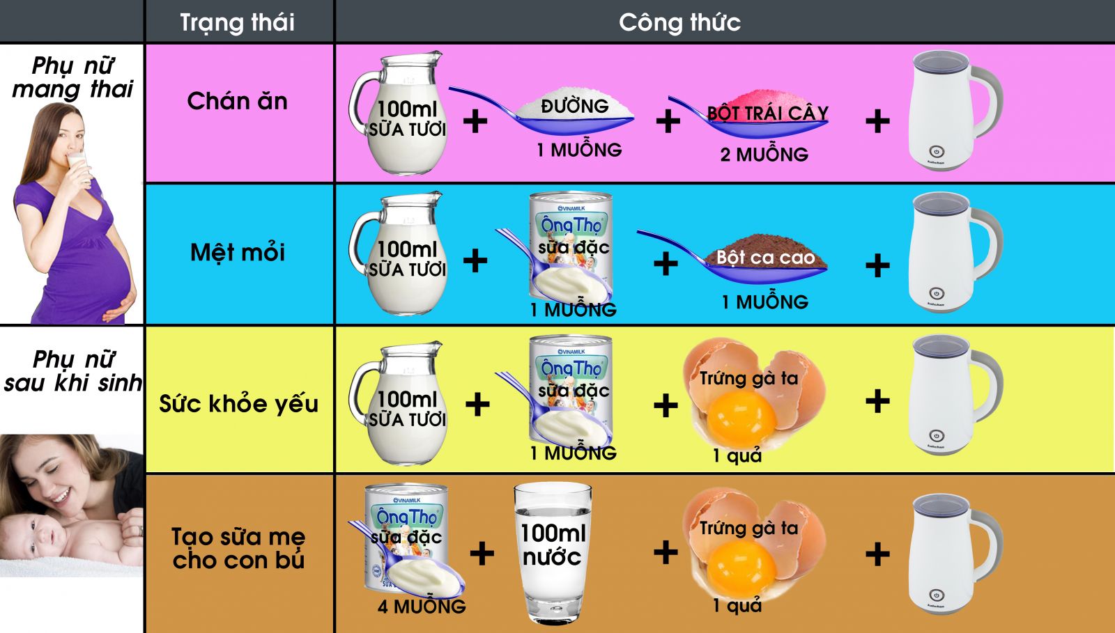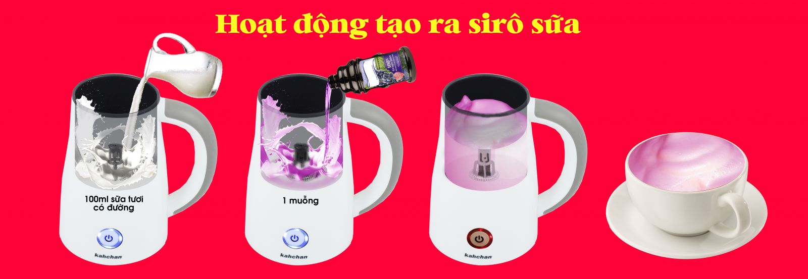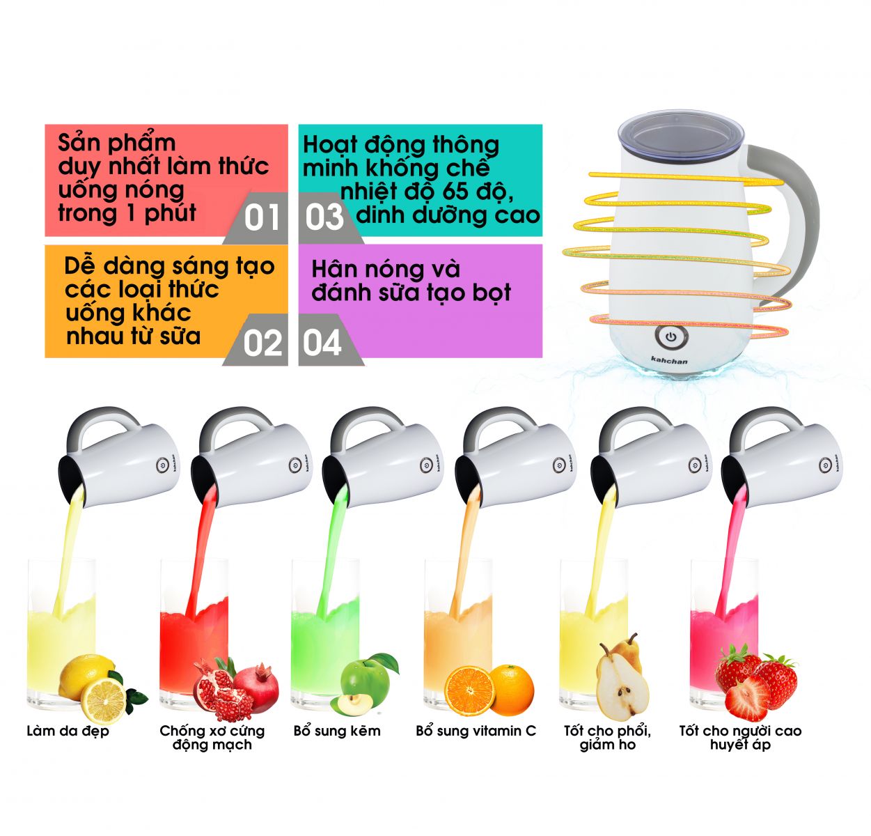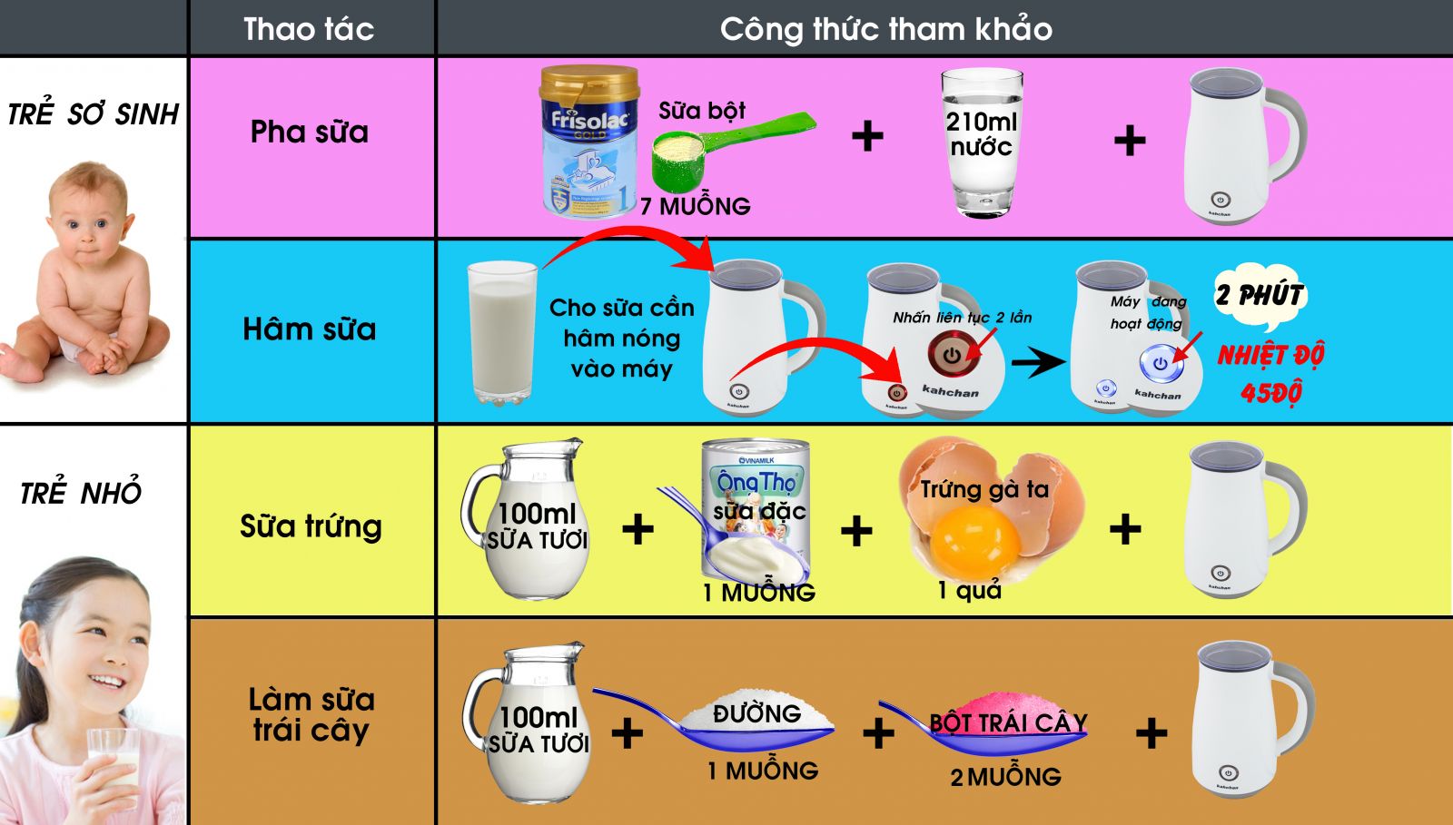 - Kahchan có 3 chế độ 1/ hâm nóng và đánh sữa: ấn nút 1 lần, lúc đánh sữa nhiệt độ khoản 65 độ, sau khi hoàn thành máy tự động ngắt điện. 2/ Hâm sữa: nhấn nút liên tục 2 lần (chức năng này dùng để hâm sữa cho trẻ sơ sinh. Đối với trẻ sơ sinh: các Mẹ nên chú ý khi pha sữa cho Bé yêu không được pha sữa quá nhiệt độ 65 độ C. vì khi sữa được pha quá 65 độ C thì sữa sẽ bị mất chất dinh dưỡng và sẽ chuyễn hóa thành 1 chất khác. Với máy đánh sữa kahchan EP2178 thì pha sữa cho bé yêu thật đơn giản: 100 ml nước sôi để nguôi + 3 muỗn bột sữa Bé yêu uống (nên cho Bé yêu uống sữa của các hang sữa lơn như: sữa bột Abbott, sữa bột Nuti IQ, sữa bột organic, Sữa bột Gain Plus IQ, sữa bột Similac, sữa bột Grow, sữa bột Dialac, sữa bột NAN pro, không nên cho Bé uống những sữa không rõ nguồn gốc sẽ ảnh hưởng đến sự phát triển của trẻ) cho vào máy đánh sữa Kahchan nhấn nút liên tục 2 lần máy sẽ tự động đánh sữa, khi sữa vừa đủ 65 độ máy sẽ tắt. và khi hâm sữa cho Bé cũng thực hiên những thao tác tương tự 3/ đánh sữa nguôi / lạnh: nhấn nút liên tục 3 lần, sau 90 giây hoàn thành việc đánh sữa, máy tự động ngắt điện.