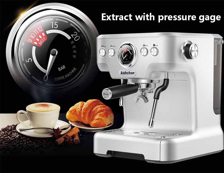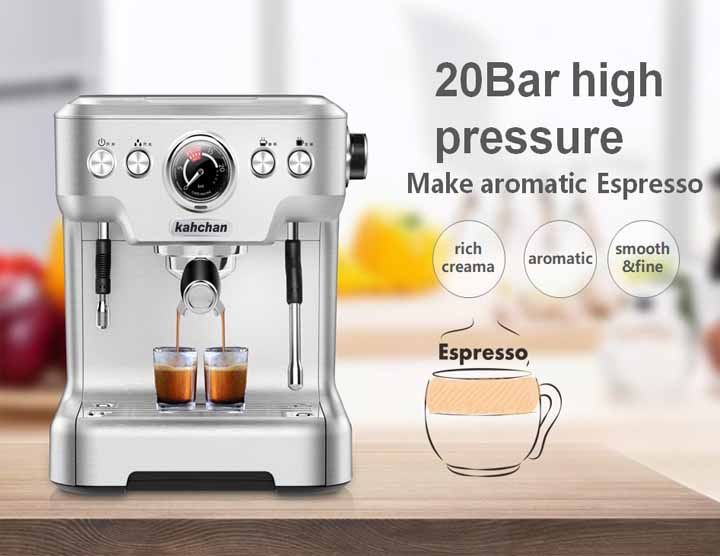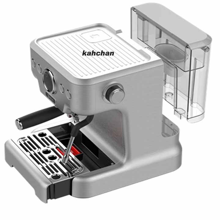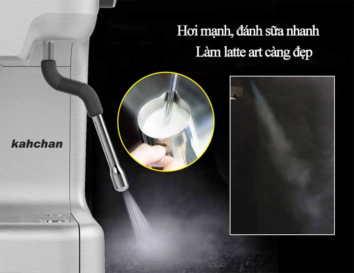 máy pha cafe espresso kahchan EP9149 là sản phẩm chuyên nghiệp pha cafe espresso cho quan cafe. máy này có những đặc trưng nổi bật như sau: 1. có 2 boiler 2 bơm nước,công suất lớn pha chế liên tục, khác với máy thường 2. chế độ pha 1 ly và 2 ly định lượng,dễ dàng thảo tác 3. pha cafe , đánh sữa, và nước nóng 3 trong 1, thao tác tiêng, không ảnh hưởng với nhau,khác với máy thường. 4. chế độ ủ cà phê, ép cà phê càng đều hơn nên cà phê chuẩn hơn 5. có vòi 1.2mm cho xịt hơi mạnh để đánh sữa nhanh chóng trong khoảng 30 giây, phù hợp cho quán có nhiều khách order latte và capuchino 6. đồng hồ có mức hiển thị hướng dẫn pha chế và chỉ thị phân khúc lý tưởng cho pha chế cafe chuyên nghiệp 7. thông số 50-60Hz, 220-240V , 2900W ,2.7 liter , 20Bar