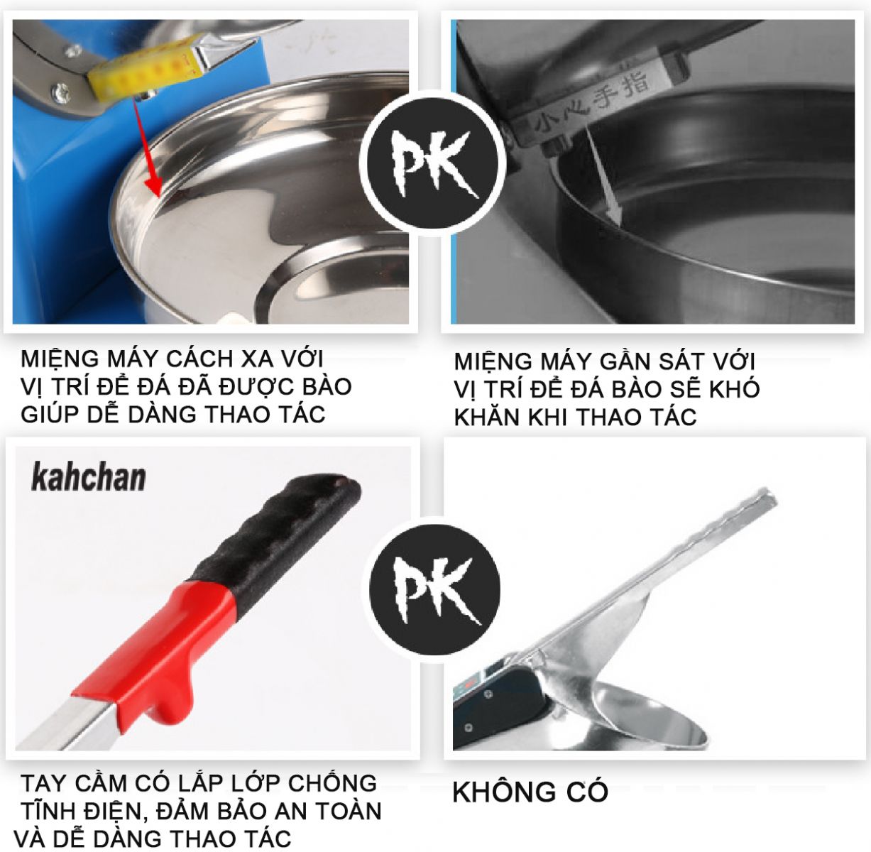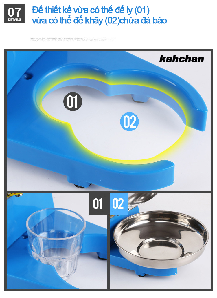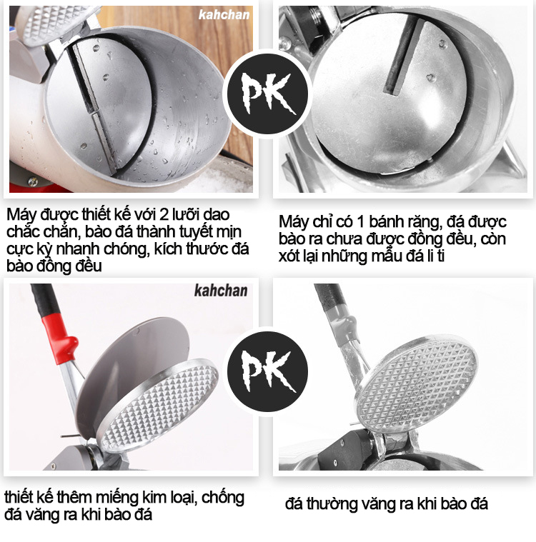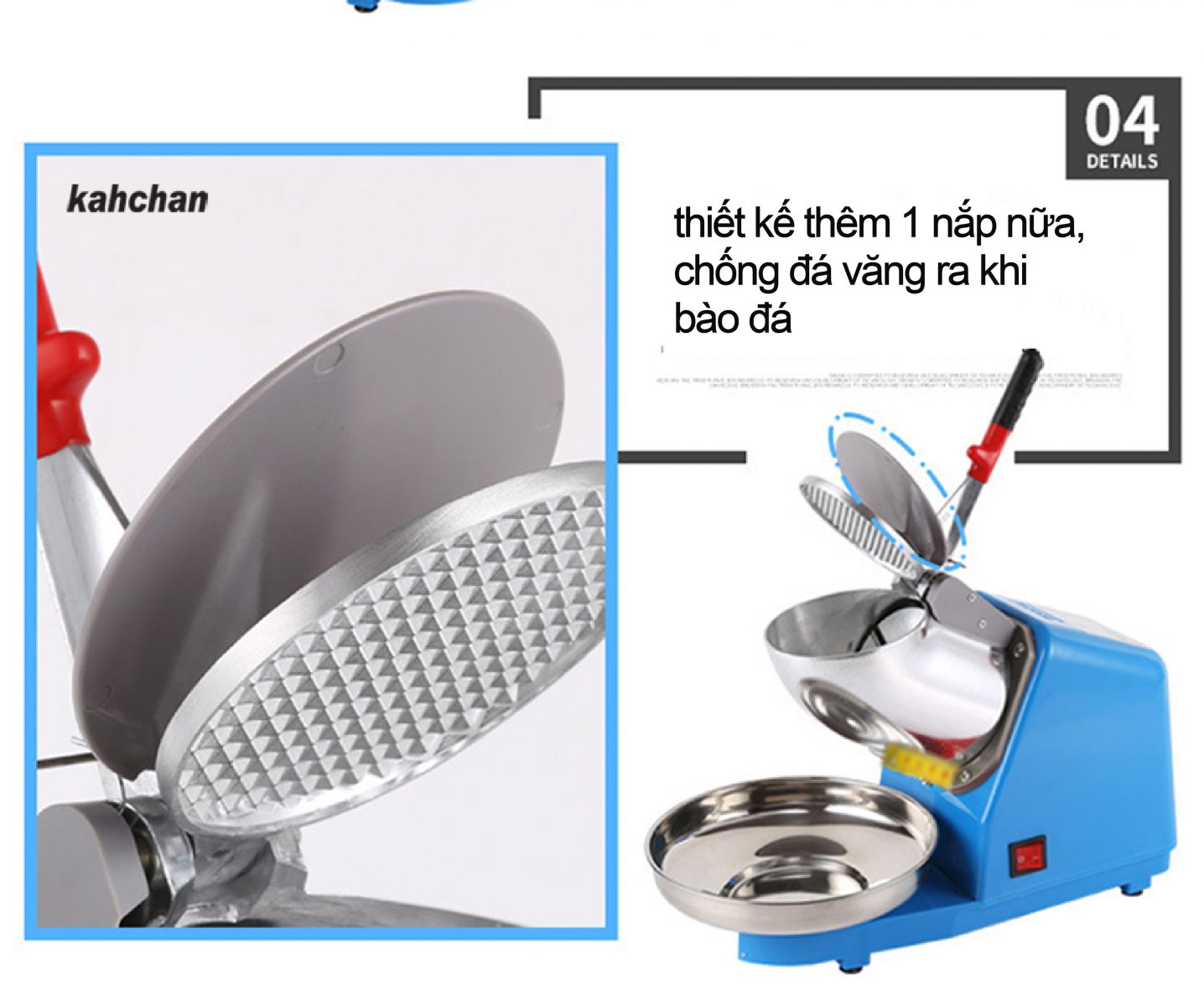 - Thứ 2, máy bào đá tuyết kahchan được thiết kế 2 nắp đậy, ngăn đá không bị văng ra ngoài trong lúc xay góp phần giúp nơi làm việc sạch sẽ.