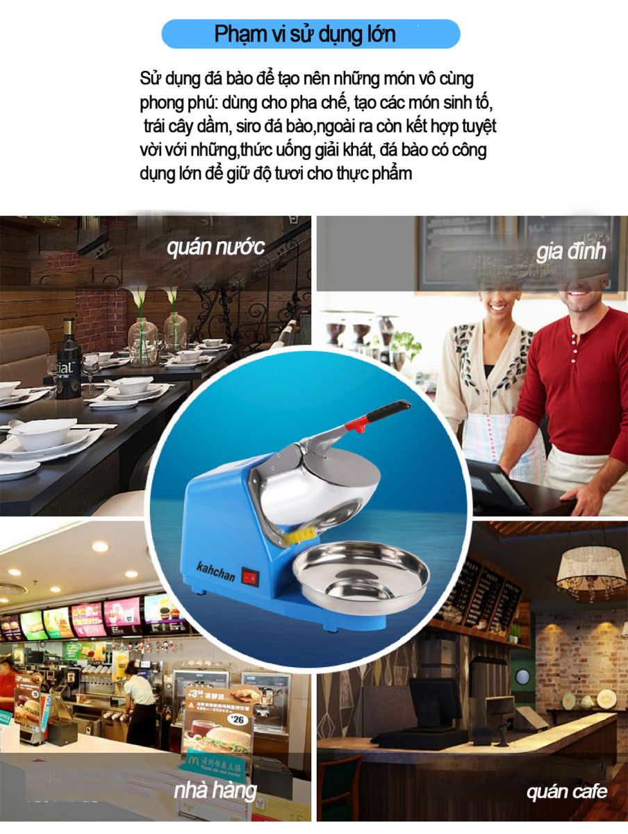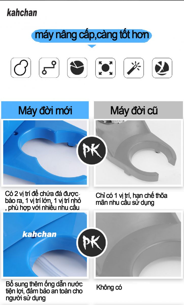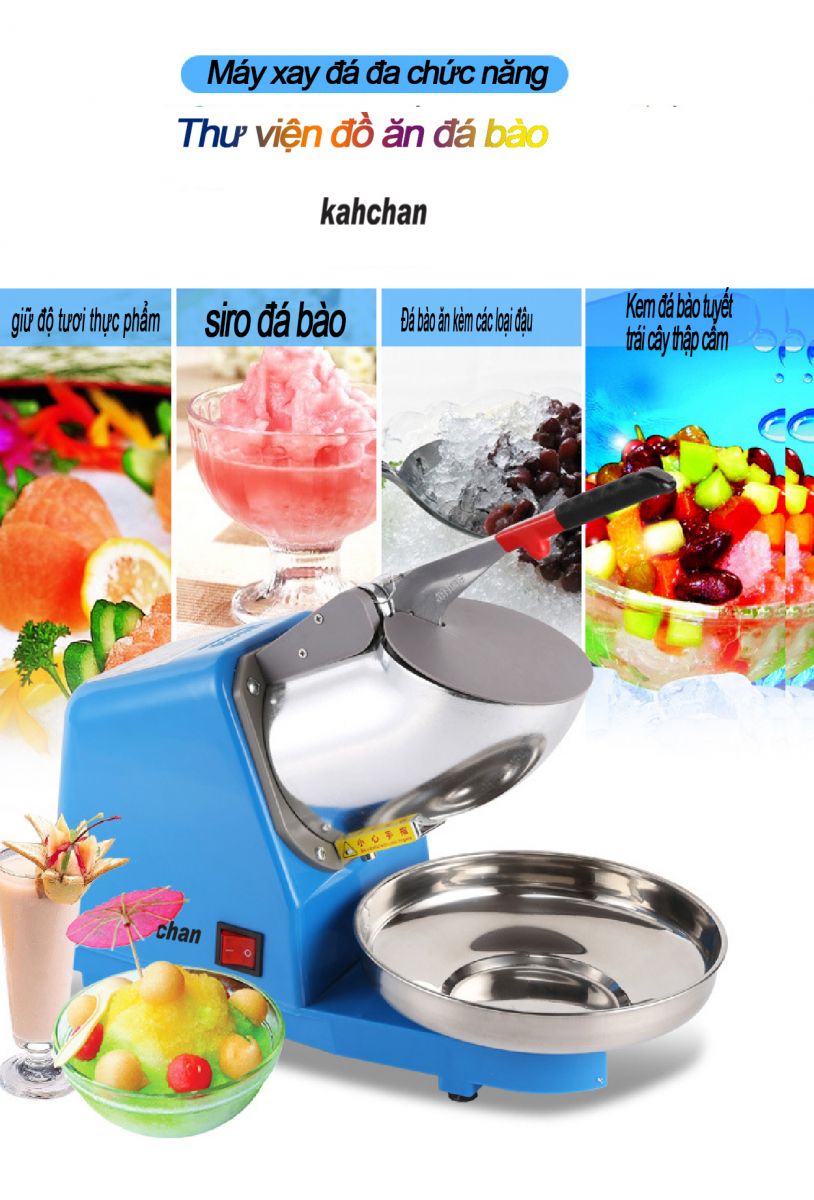 - Máy bào đá siêu mịn như tuyết do được cấu tạo bởi 2 lưỡi bào, bào đá nhanh, mịn. Đá càng lơn, càng ráo bào bào càng mịn. Máy bào đá tuyết kahchan bào được mọi loại đá: đá bi, đá lơn, đá ẩm,.... với độ mịn như mong muốn.