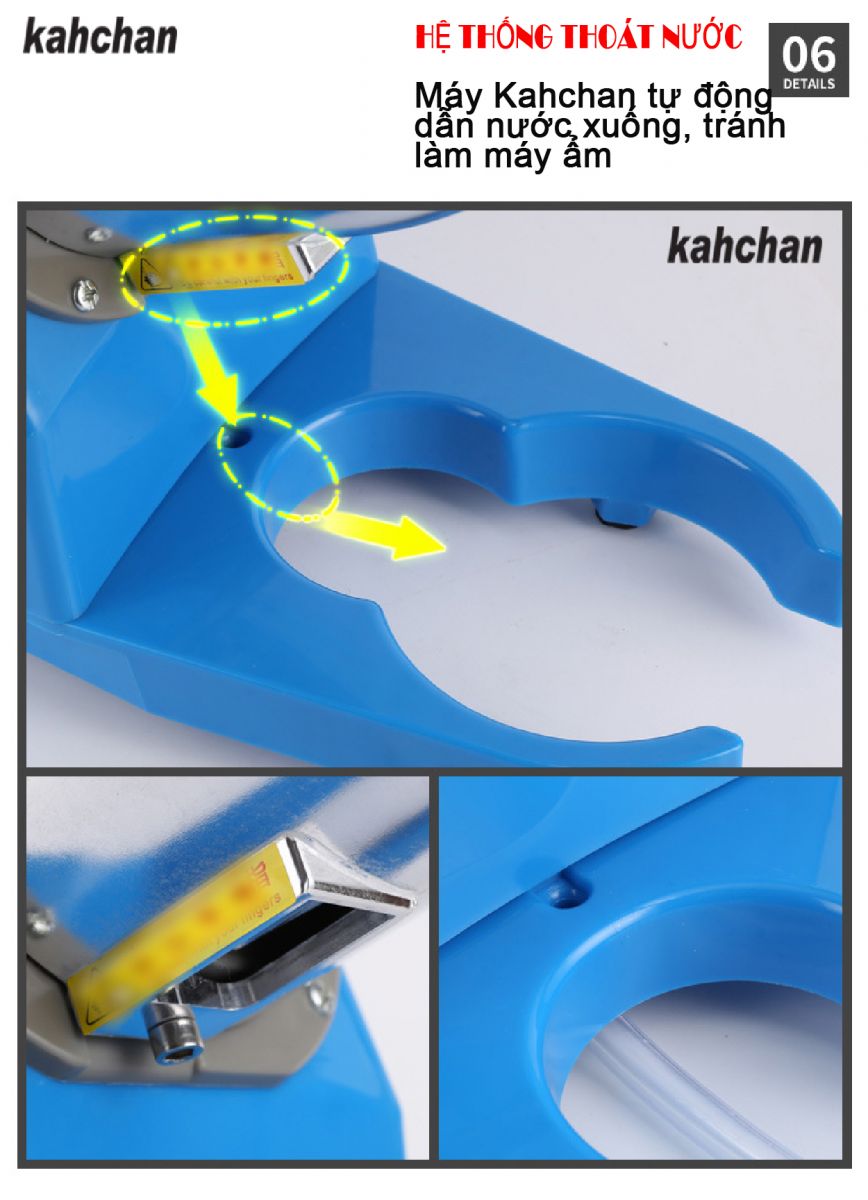- Tiếp theo là ống thoát nước của máy bào đá tuyết kahchan là một điểm khác nữa so với dòng máy bào đá truyền thống. Với chiếc ống dẫn nước này, các nước còn lại sẽ được đẫn đến nơi bồn chứa nước, làm cho nơi làm việc luôn khô ráo.