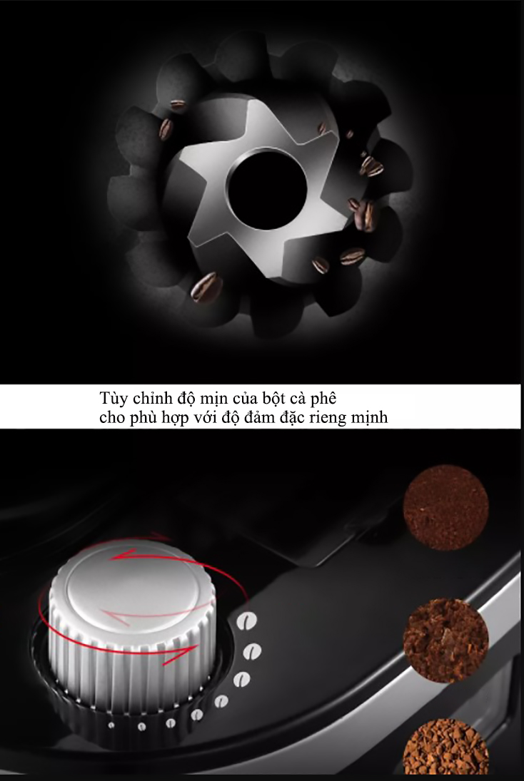 May này có thể xay cà phê và pha cà phê tự động! Mình có thể cài đặt độ mịn bột cà phê và độ đậm đặc nước cà phê theo khẩu vị riêng mình! Máy có chế độ hẹn giờ pha chế! Máy có thể chọn pha 2-12 ly! Máy có bình nước 1.7 liter! Máy thiết kế lộc thẳng bột cà phê vào phin , không chưa cà phê trong máy, sạch sẽ hơn!