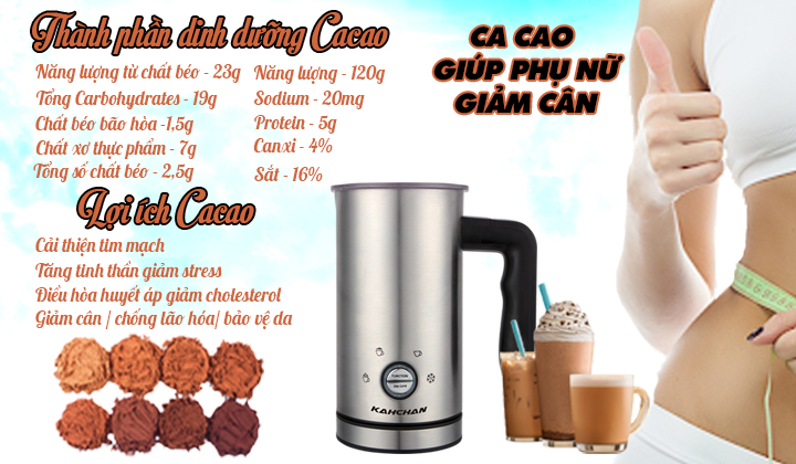 Bột ca cao có rất nhiều công dụng tốt cho sức khỏe bởi vì bột cacao chứa nhiều chất oxy hóa có vai trò kháng khuẩn và chống oxy hóa hiệu quả. có thể giúp ngăn ngừa bệnh tim mạch, ung thư và lão hóa tế bào. Bột cacao cũng có tác dụng giúp cải thiện tuần hoàn máu và hệ tiêu hóa,uống cacao có thể giảm cân và vòng eo thon gọn cho phụ nữ những thành phần dinh dưỡng trong bọt cacao : chất chống oxy hóa, các chất khoáng như canxi, magiê, lưu huỳnh, đồng, sắt, kẽm và kali, axit oleic là một chất béo không bão hòa đơn cần thiết cho sức khỏe tim mạch, chất xơ và vitamin E, B2, B1, B5, B3 và B9 các món trong quán liên quan về cacao có như: cacao sữa, cacao cà phê, cacao quế,trà sữa cacao, cacao bạc hà, cacao nóng,cacao đá