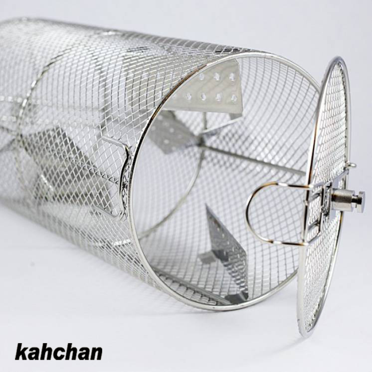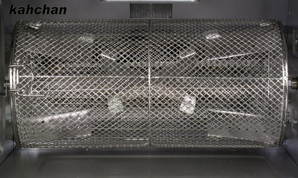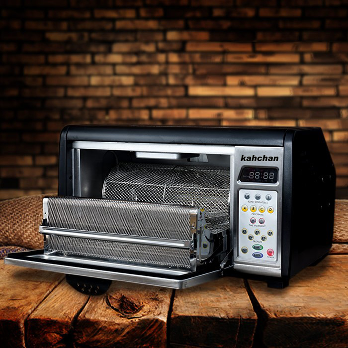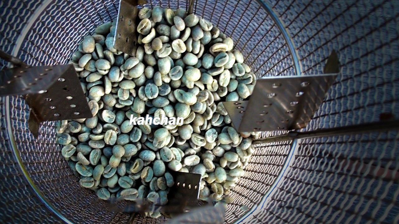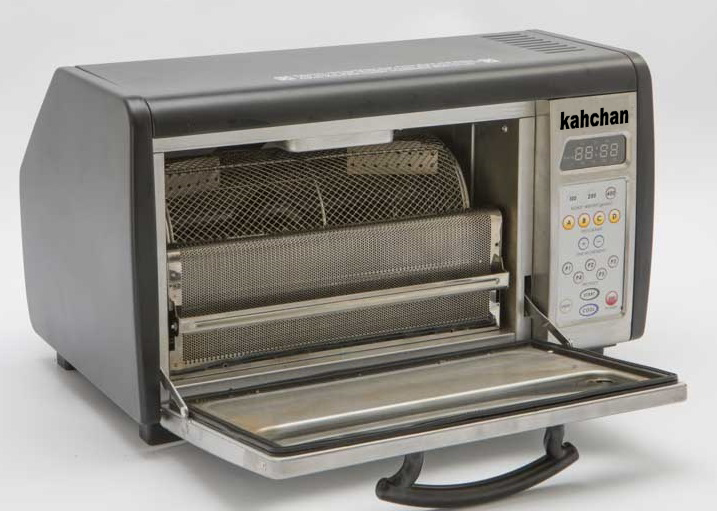 Máy rang cà phê kahchan, mỗi lần rang được 500gr trở lại, có chế độ cài đặt 100gr, 200gr,.. tự động khống chế nhiệt độ, đảm bảo cà phê ra khác máy rang cà phê bằng ga, rang đều hơn, chín hơn, rang từ màu nhạt đến màu đậm theo khẩu vị các nhân, đặc biệt phù hợp công ty cử hàng bán hạt cà phê tư để rang mẫu cho khách hàng coi, thời gian rang chỉ 15 phút, quá trình rang bao gồm 2 lần nở, so mấy rang bằng ga, máy rang này rang xay không có khói, có hệ thống tự diệt khói, không cần lắp ống thoát khói. Cả máy bao gồm 2 hệ thống rang xay và coolant làm lạnh lại Có lồng inox chưa hạt cà phê đã rang xong lớn, và phần chưa vỏ cà phê